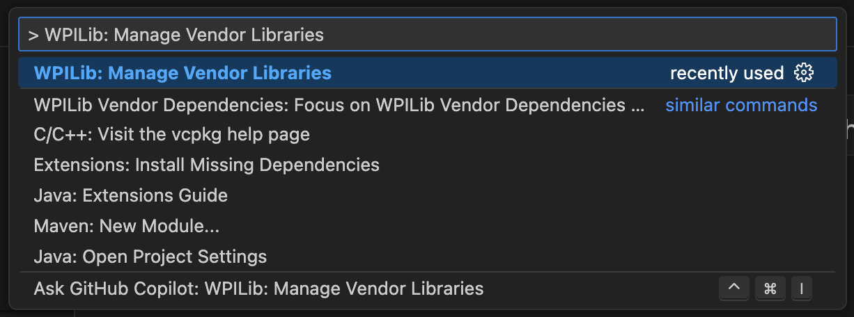 - In WPILib VSCode, open the Command Palette (Ctrl+Shift+P) and select WPILib: Manage Vendor Dependencies